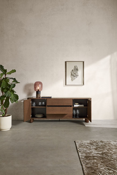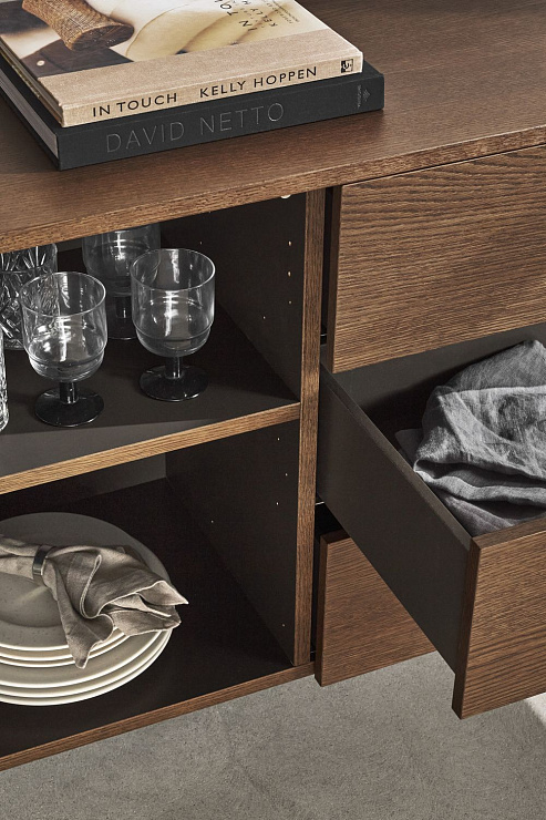 Буфет Santiago представлен в трех разных вариантах: с дополнительными выдвижными ящиками, с откидным фасадом с деревянной полкой, а также с барной секцией с зеркальной задней панелью и встроенной подстветкой, которая включается при открывании.